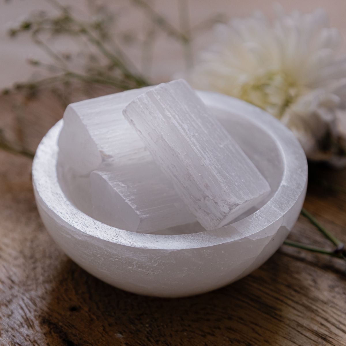 Cuenco de selenita de primera calidad. Puede usarse como despojador de cristales o anillos.