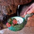 Experimenta la esencia mística de los sahumos con la Sahumadora Serpiente. Esta sahumadora de cerámica no solo cumple una función práctica, sino que también es una obra de arte elaborada con atención meticulosa. Las escamas en el cuenco y en la serpiente son modeladas a mano, una por una, para crear una pieza única. Utiliza la cabeza de la serpiente como asa para sahumar tus espacios con gracia y estilo.